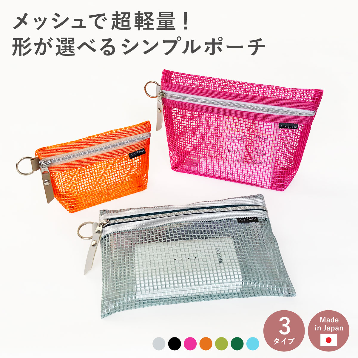 カラフルなメッシュ生地を使用したシンプルなデザインのポーチ。マチ付きとマチなしから選べる。メッシュだからとても軽い!